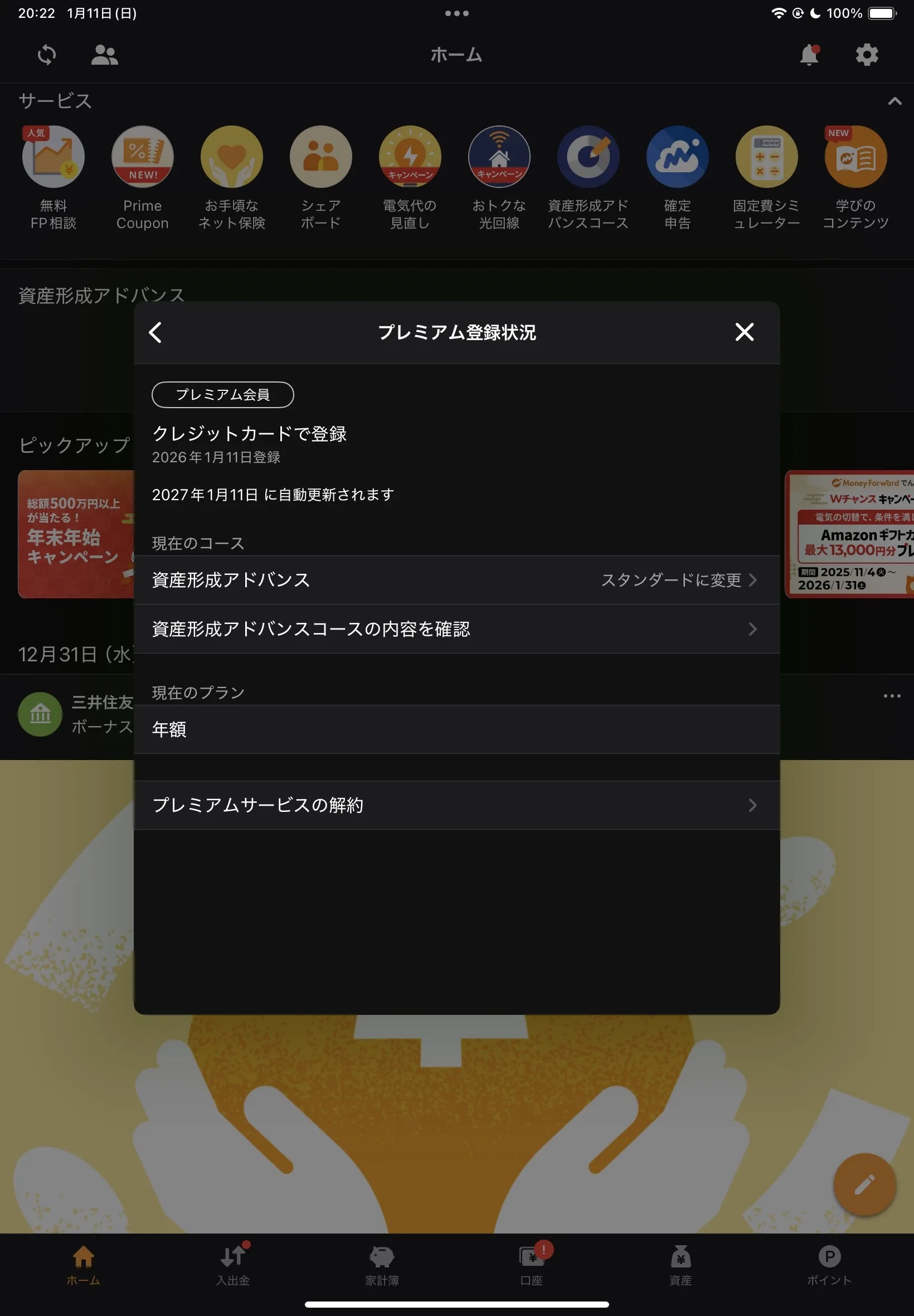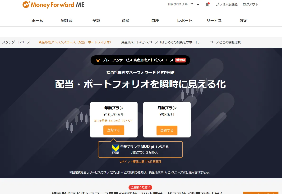 いままではスタンダードコースだったのですが、もらえるVポイントを考えると、今までの料金と大差が無いなと思ったからです。資産形成アドバンスコース: 8,770円 = 10,700円 - 800pt(マネーフォワードのおまけ) - 1,070pt(三井住友のおまけ)