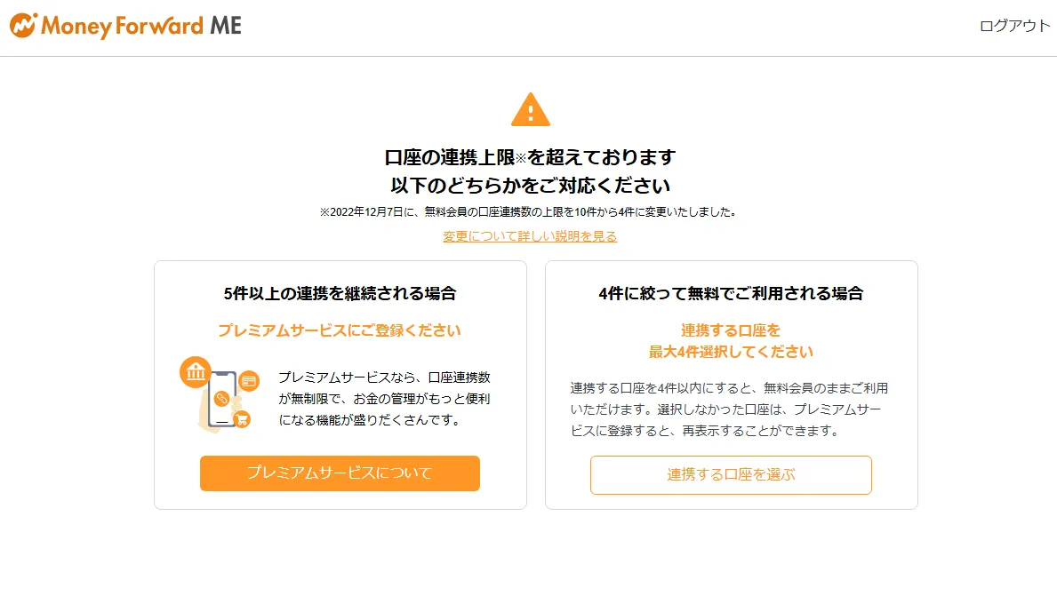 マネーフォワード ME は、無料会員だと金融関連サービスの連携が最大4件です。