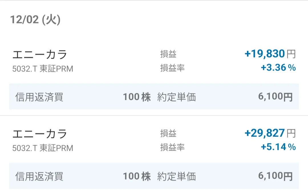 - 返済:2025/12/02|200株|平均約定単価 6,100円