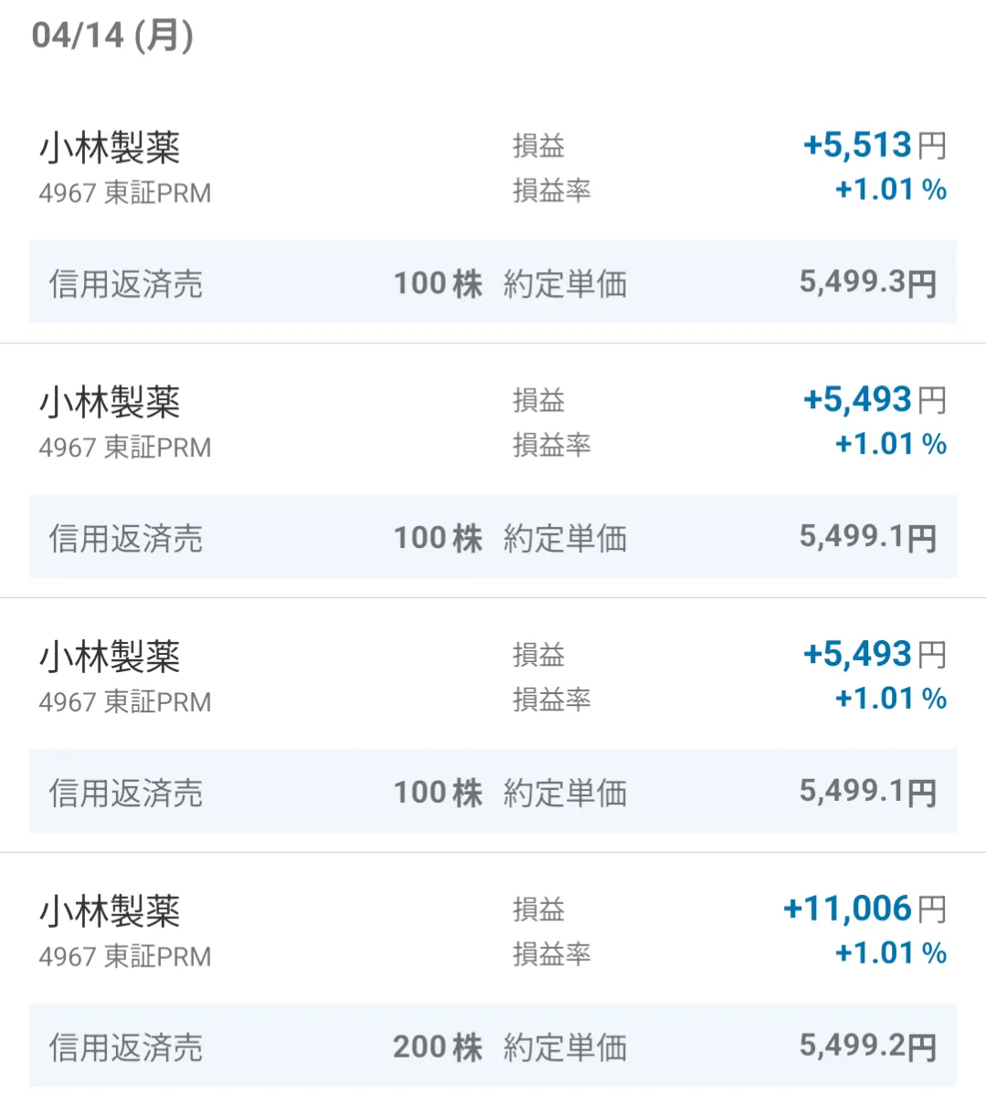 2025/04/03 → 2025/04/14|ロング|小林製薬|500株|純 +25,420円