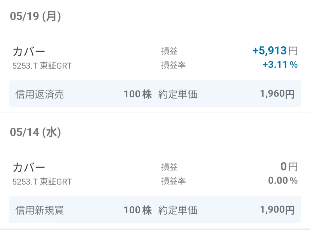 - 返済:2025/05/19|100株|約定単価 1,960円