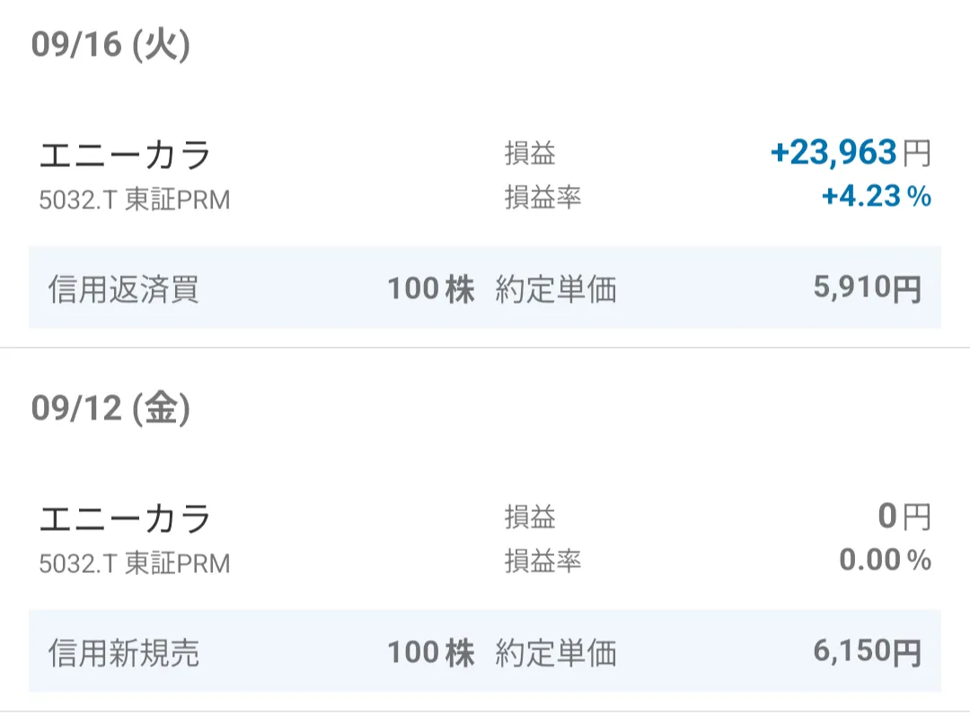 - 返済:2025/09/16|100株|約定単価 5,910円