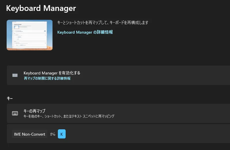 たとえば、PowerToys の Keyboard Manager を使えばキーの再マッピングができます。